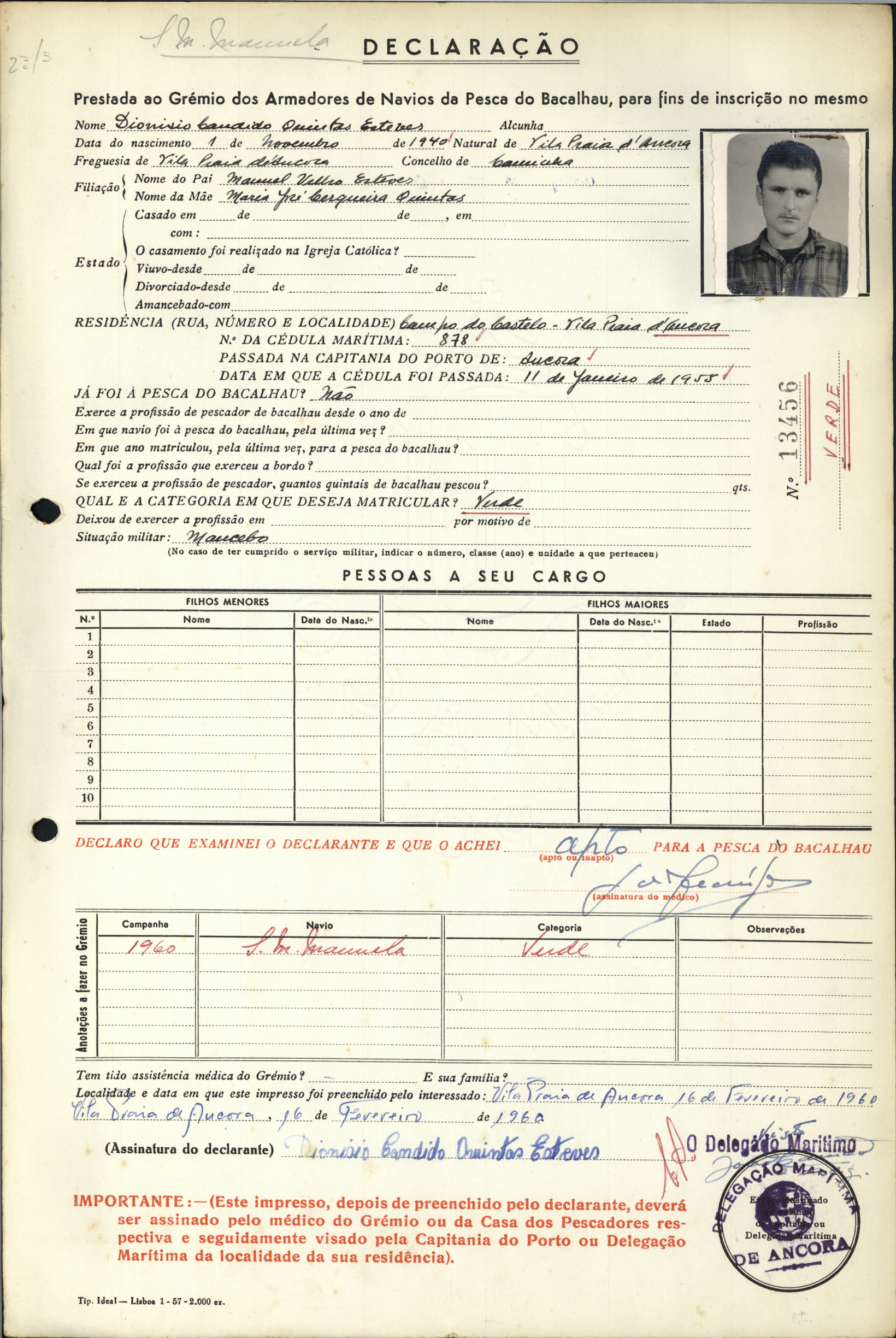 pescador das Caxinas, trabalhou no navio Santa Maria Manuela em 1960.